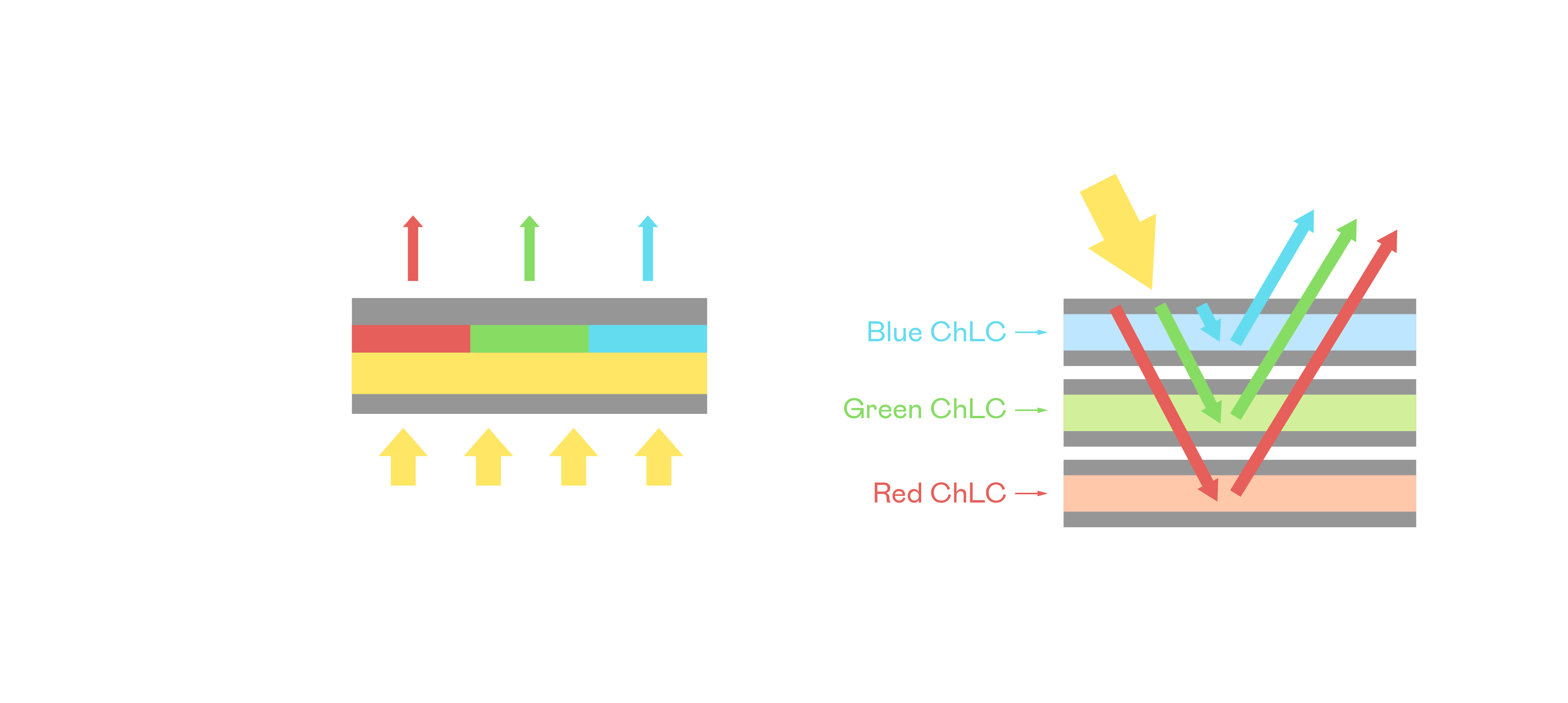 VR彩票胆固醇液晶显示器是由红、绿、蓝三层胆固醇液晶面板堆叠而成,并采用无彩色滤光片设计,减少环境光在反射过程中的损耗。